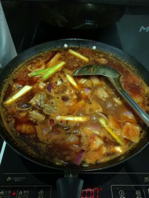 加黄豆酱油炒几下,加入开水,加入料包,再加入土豆中火煮一小时。