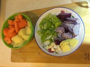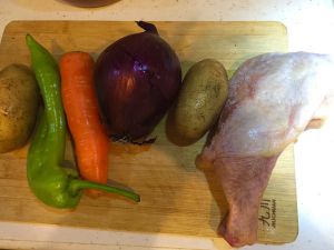 鸡腿剁成小块,土豆、西红柿、洋葱、辣椒切块,葱切段,姜切片,蒜剥好。