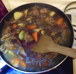 炖个十分钟后,加入土豆和青椒。炖到土豆软烂即可。