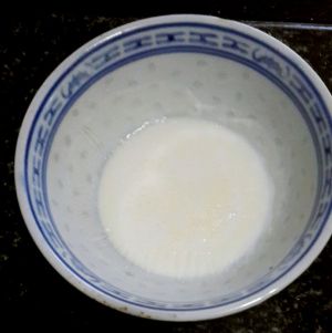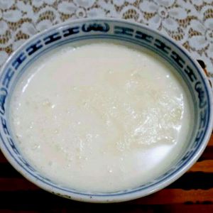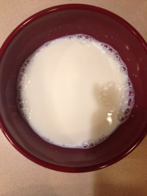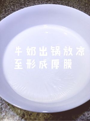 煮好的牛奶放凉了会有一层奶皮,把奶皮拿出,略留一些牛奶在有奶皮的碗里。