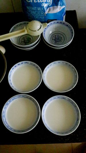温水冲奶粉。准备碗,如果做4碗双皮奶需要准备8个碗