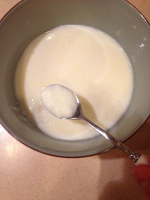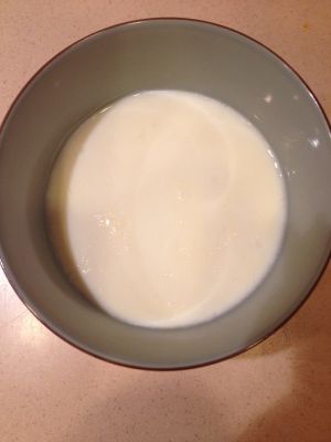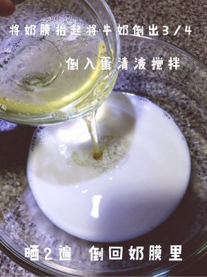 牛奶冷却了之后表面会有一层奶皮,把皮留下然后把剩余的牛奶轻轻倒进蛋清里,加点糖搅拌均匀。记住,一定要等牛奶冷却之后才可以加进蛋清里面哦!