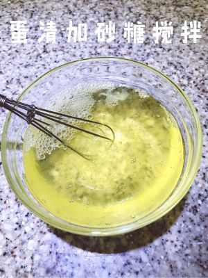 在煮牛奶的时候,把蛋清打匀,放白砂糖在打匀的蛋清里。