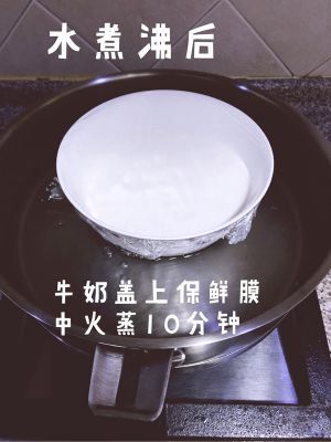水煮沸后牛奶盖上保鲜膜中火10分钟