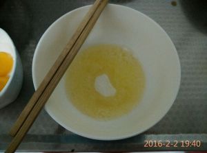 将蛋白和蛋黄分开,蛋黄不用,蛋白用筷子打散,备用;