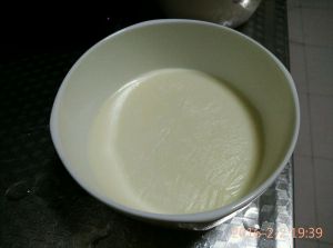 牛奶加热好了,可以把糖先放进去融化,然后倒进要做双皮奶的容器里,放凉先!(我有做双皮奶专用的瓷器)