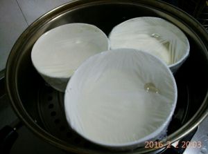 将牛奶蛋白混合液过滤数次后,沿碗壁轻轻倒回之前的奶皮碗里,然后盖上保鲜膜,放入蒸锅;