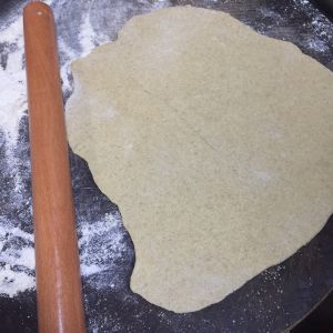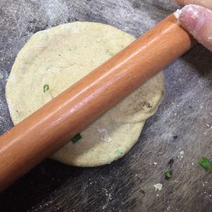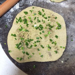面饼撖薄,然后一层盐,一层葱,卷起来撖薄