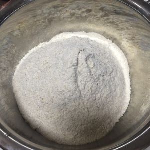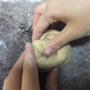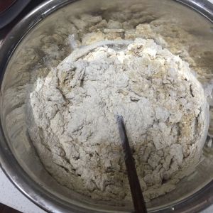 猪油隔水化开,加入食用油,适量食用盐(猪油食用油比例1:2),边搅拌边加入面粉搅拌均匀