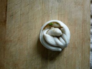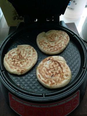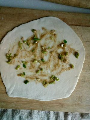 面发酵好,擀皮,依次放盐,油,香葱末,卷起来,再擀皮,下锅