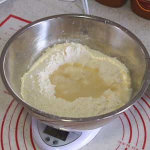 将开水倒入面粉中,开始揉面。