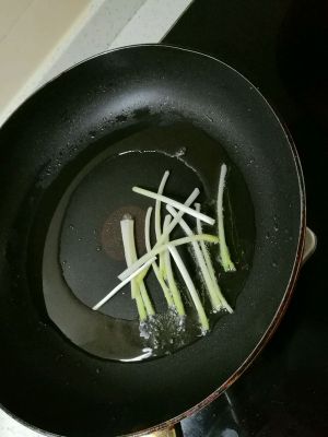 制作油酥。锅内倒入少量油,加热,将切好的葱白段放入油锅炸香。直到把葱白炸的金黄,便可以关火,并把葱白段捞出扔掉。