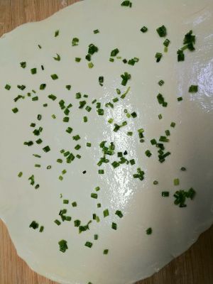 加入盐,用擀面杖把盐按进面里。放橄榄油,葱花适量。