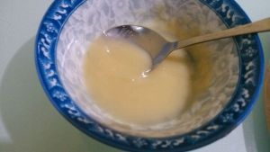 小碗里放两勺面粉,倒入热油搅拌至糊状。