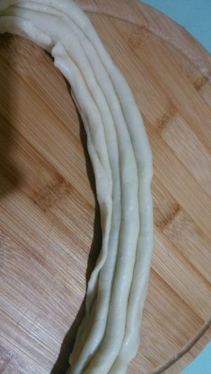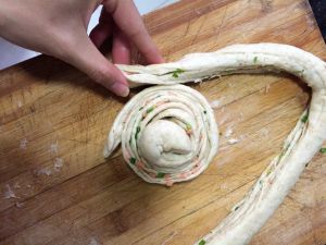 把面饼卷成长条,盘成巴巴形状等待备用。