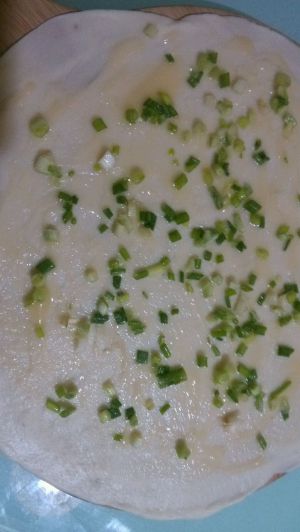 将小面团擀成约1cm的饼,倒入两汤勺葱油,抹匀~