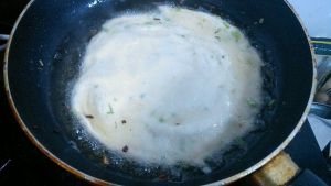 平底锅涂一层油,小火煎饼 大约半分多钟翻面