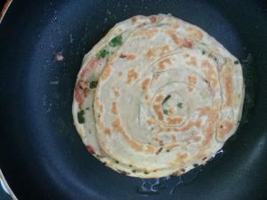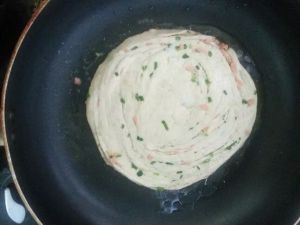做了两种方式,其中一种是反复对折成长条盘起来,另一种的话是卷成长条盘起来,两种方式主要不同在于葱花是否暴露,后面煎饼的过程中暴露的葱花很容易糊掉,影响美观和味道。