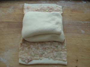 附两种卷法: 卷法一:擀成1厘米厚度的面片上先涂层油酥,然后放入葱粒火腿粒,撒少许胡椒粉椒盐 从长变开始卷起,卷成长条 然后继续搓长 压扁