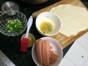 醒面过程中准备材料 火腿切粒 越小越好 葱花切粒 油酥准备:把烧好的热油倒进装少许面粉的碗里 加入胡椒粉 葱花调匀成稍稀的混合物