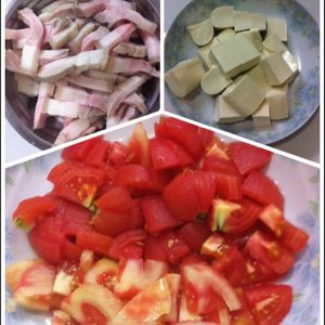 番茄划十字刀放入开水烫,剥皮切成丁,豆腐切块,猪肉切条!