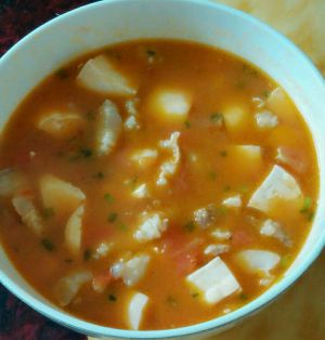热锅倒油,放入番茄炒,炒出番茄汁,倒入番茄酱加水煮开后放入猪肉和豆腐,煮到汤汁浓稠后加入盐,鸡精,醋,糖,出锅!