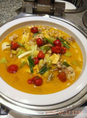 腌制好的田鸡下锅炒一会,捞出,把切好的菇,豆腐泡等放锅里煮开