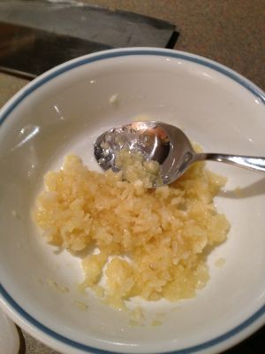 把热油浇到蒜泥上,拌匀。用热油让蒜头断生。