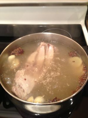 肉煮至沸腾后下辅料,姜、大葱、花椒、大蒜!这样煮出来的白肉更香!