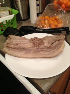 1五花肉凉水入锅,加入葱姜和盐,料酒,花椒粒,盖上锅盖,大火煮开后转小火煮18分钟左右关火,焖到汤汁凉至五花肉熟透。