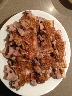 先将蒜泥放上卷好的白肉上,再将调好的佐料倒入!OK完工!