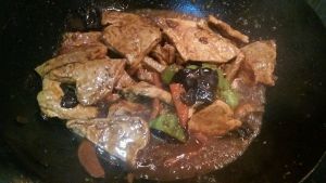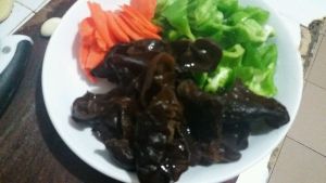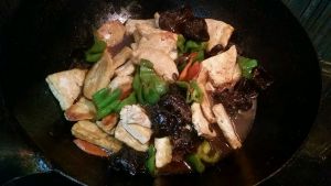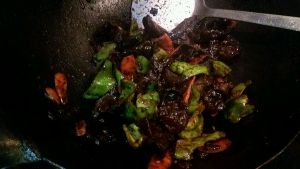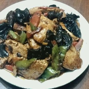 留底油,葱姜蒜炒出香味,放木耳,胡萝卜,青椒翻炒,放少许盐,酱油
