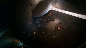 锅内油热后放入红尖椒和豆瓣酱,加些糖炒匀。