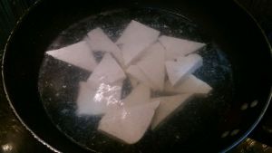 豆腐切片,不易太厚,煎至两面微黄