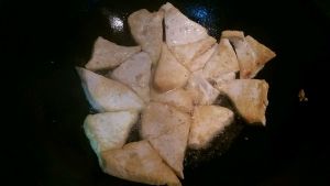 豆腐切块,油里煎至金黄色捞出