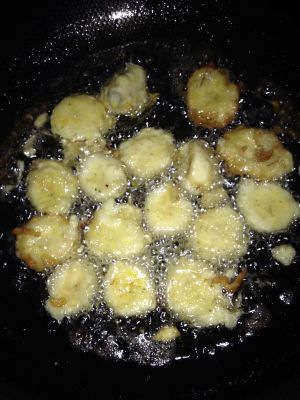 倒油入锅加热,油多点,香蕉裹上面糊入锅炸,炸至金黄色冷却