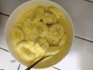将鸡蛋和面粉放入香蕉里面,拌匀。