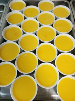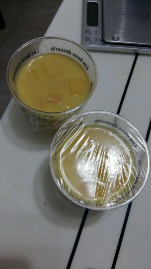 把布丁奶液倒入小碗或小杯中,由于网上采购的容易还没到手,所以只能将就用家中的微波容器。。。