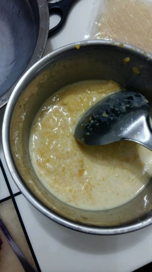将奶液倒入芒果泥中,用橡皮刮刀翻拌均匀,成为顺滑的芒果布丁奶液