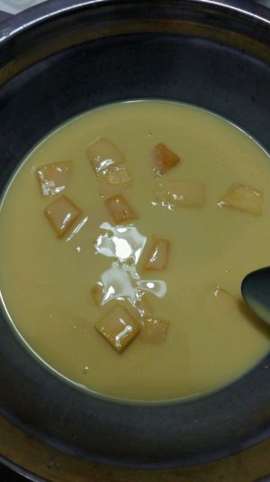 过筛后加入适当的芒果丁和泡软的吉利丁搅拌