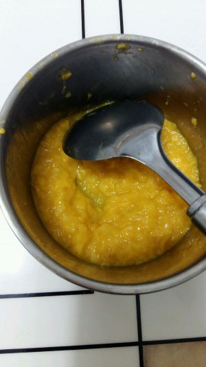 吉利丁片提前用冰水泡软备用。芒果取果肉搅打成泥