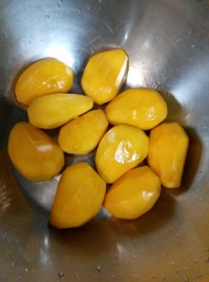 将芒果竖着切半,在果肉上切小1公分的十字花刀,然后用勺挖出果肉;吉利丁片用凉白开泡软备用