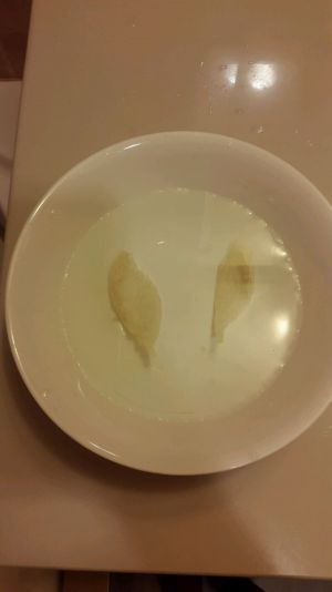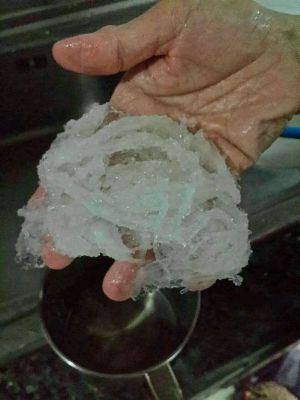 在纯净水中泡发三至四小时,泡发至如图,丝丝分明即可,千万不可有未泡开的块。泡发过程中可以用手轻轻撕开燕窝。