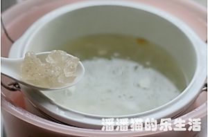 一小时后依据个人的喜好放入冰糖,盖上盖子再炖十余分钟,待冰糖溶化即可。放凉后将装炖盅放入冰箱冷藏,每天早上用干净的勺子盛出两勺享用。