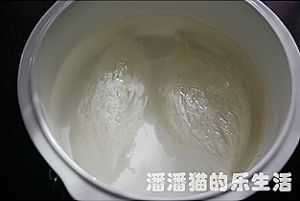 在锅里放上水,煮开之后,再将炖盅放入,转小火,炖25~30分钟,炖好的燕窝表面上会有一颗颗非常小的小泡泡,你会闻到一股蛋清味,特别好闻。注意 炖的时间不要太久,不然会化成水哦!