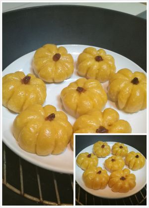 南瓜切块隔水蒸熟,我这个掉下水啦,有点湿,我就要最上面水分少的……把它压成泥状……前几天做的,现在才上传了……呵呵
