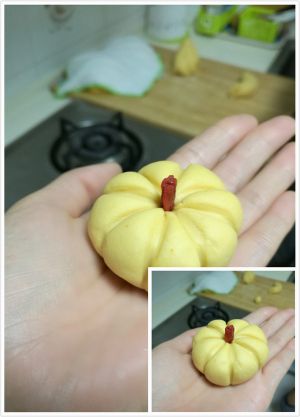 南瓜饼生胚面子上压好纹路厚,侧面四周都要顺着面子上的纹路向中心再用力压一下,这样原先被压扁的小南瓜饼就会立体起来,造型更像一个小南瓜。