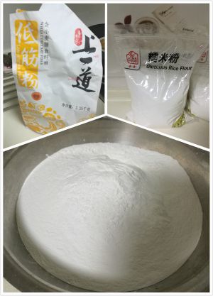 另拿个碗,倒入糯米粉,将南瓜泥一点点加入糯米粉的碗中,混合捏成团(好处是量好拿捏,如果直接将糯米粉放入南瓜泥的碗,会需要教多的糯米粉,可能碗放不下,一开始捣鼓的时候会很费劲,手很酸T^T)