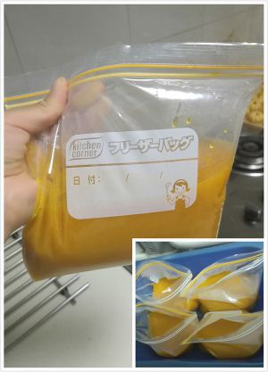 煮熟后的南瓜再放入料理机里打成泥,使南瓜泥更加细腻些备用。(如果南瓜泥偏多,可以装袋速冻,以便以后再用。)