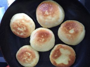 平底锅烧热,刷一层油,将饼放入锅中,注意要留出一些距离,以免粘连。
